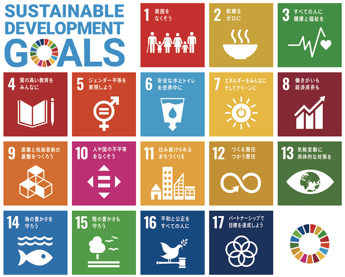 SDGs(エス・ディー・ジーズ)とは「Sustainable Development Goals(持続可能な開発目標)」の略称です。2015年9月「国連持続可能な開発サミット」にて採択された「持続可能な開発のための2030アジェンダ」に記載されている2016年から2030年までの国際目標です。貧困に終止符を打ち、地球を保護し、全ての人が平和と豊かさを享受できるようにすることを目指し、「世界を変えるための17の目標」が掲げられ、「地球上の誰一人として取り残さない(leave no one behind)」ことを誓っています。